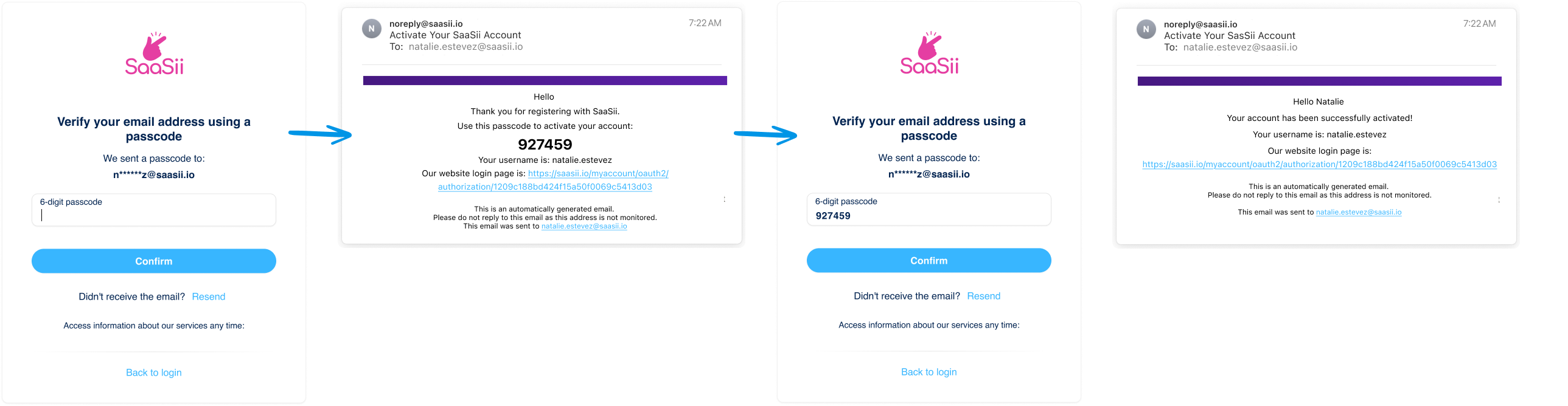 - Upon success, Strivacity confirms activation (both on-screen and via email) and proceeds to the next step in the journey.