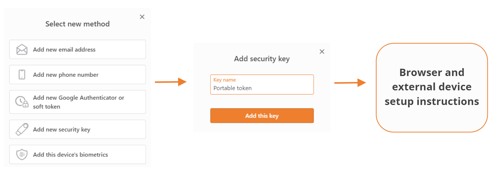 Customers add the name of their passkey and then follow the instructions of their browser and operation system's biometric setup instructions. The enrolled passkey can be removed anytime and replaced by another one by repeating the setup process.