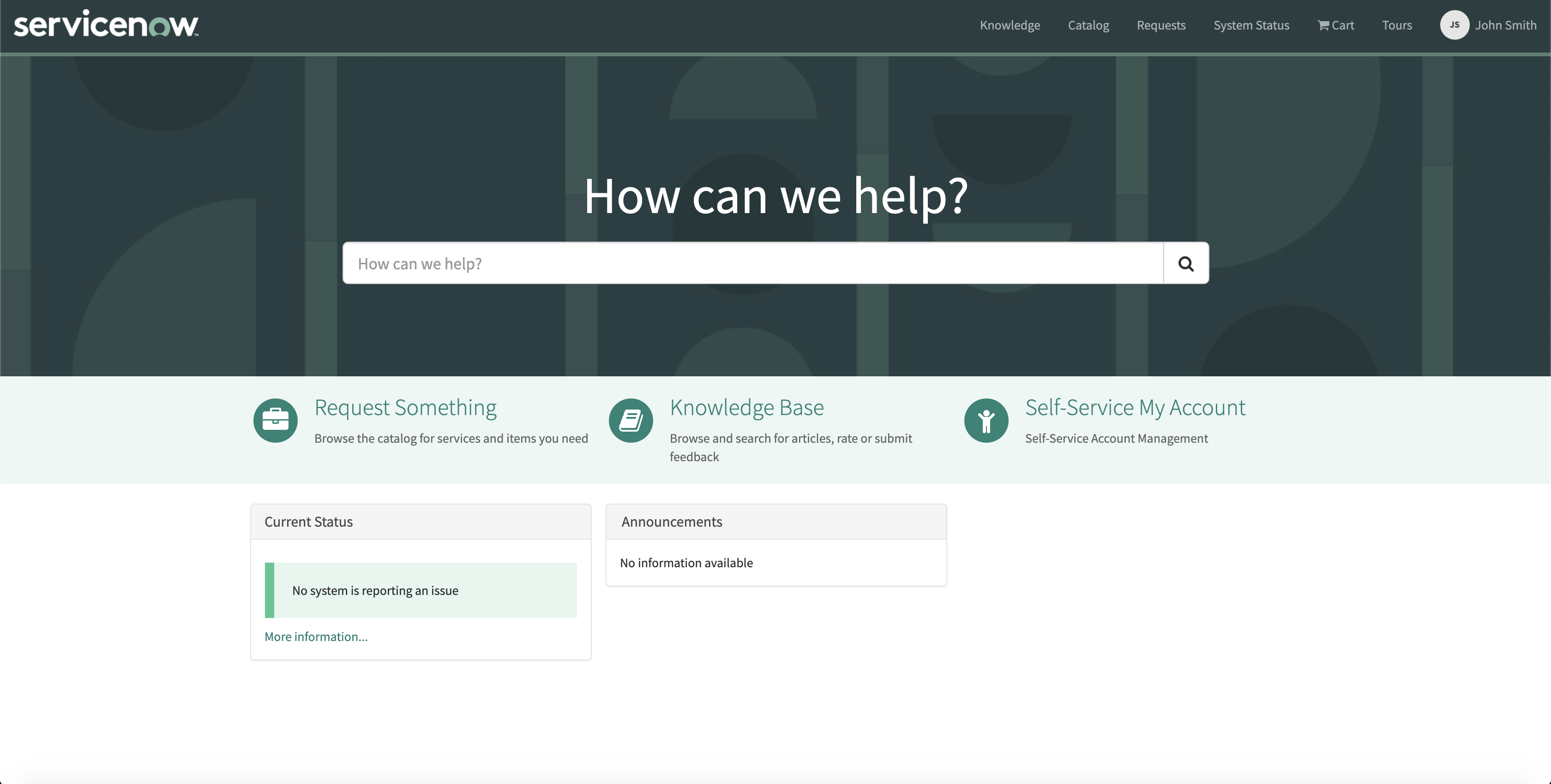 - If you now log-in using a customer account the Self-Service My Account link will now be displayed in the ServiceNow Service Portal Portal page, as shown in the screenshot below.