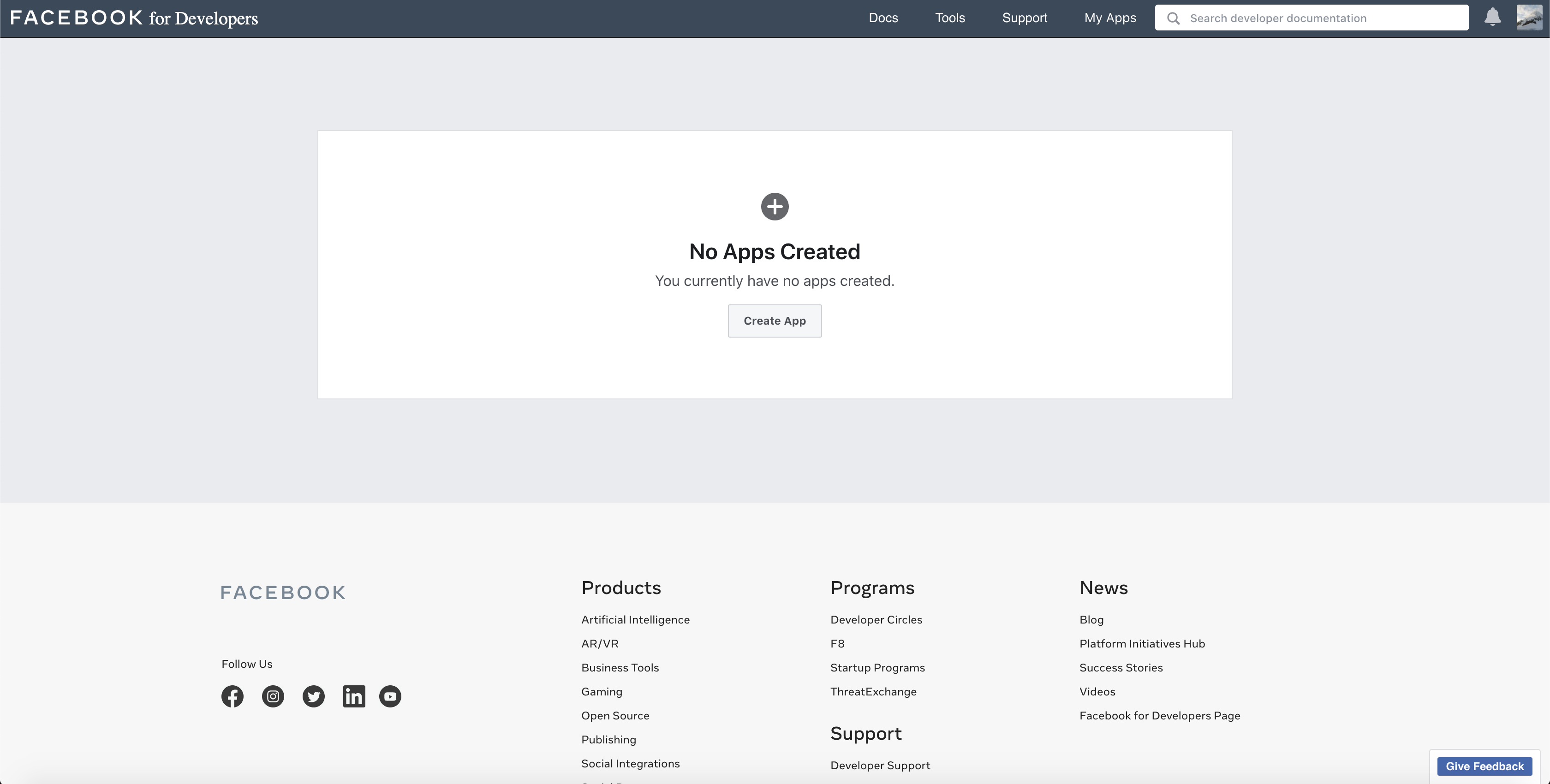 - Click on 'Create App' from the Facebook for Developers screen: