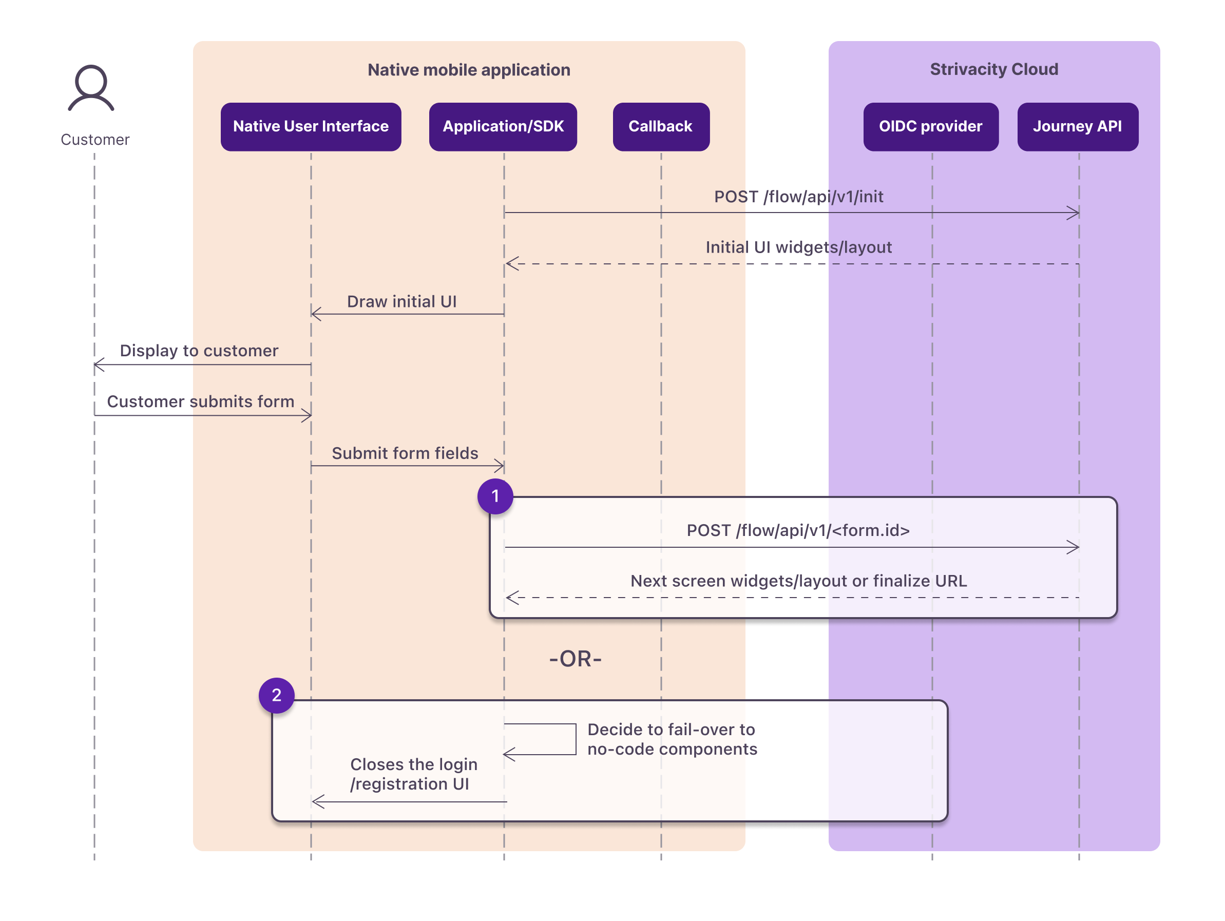 Flow diagram showing how a native app decides to fail over to Strivacity’s no-code components during login or registration