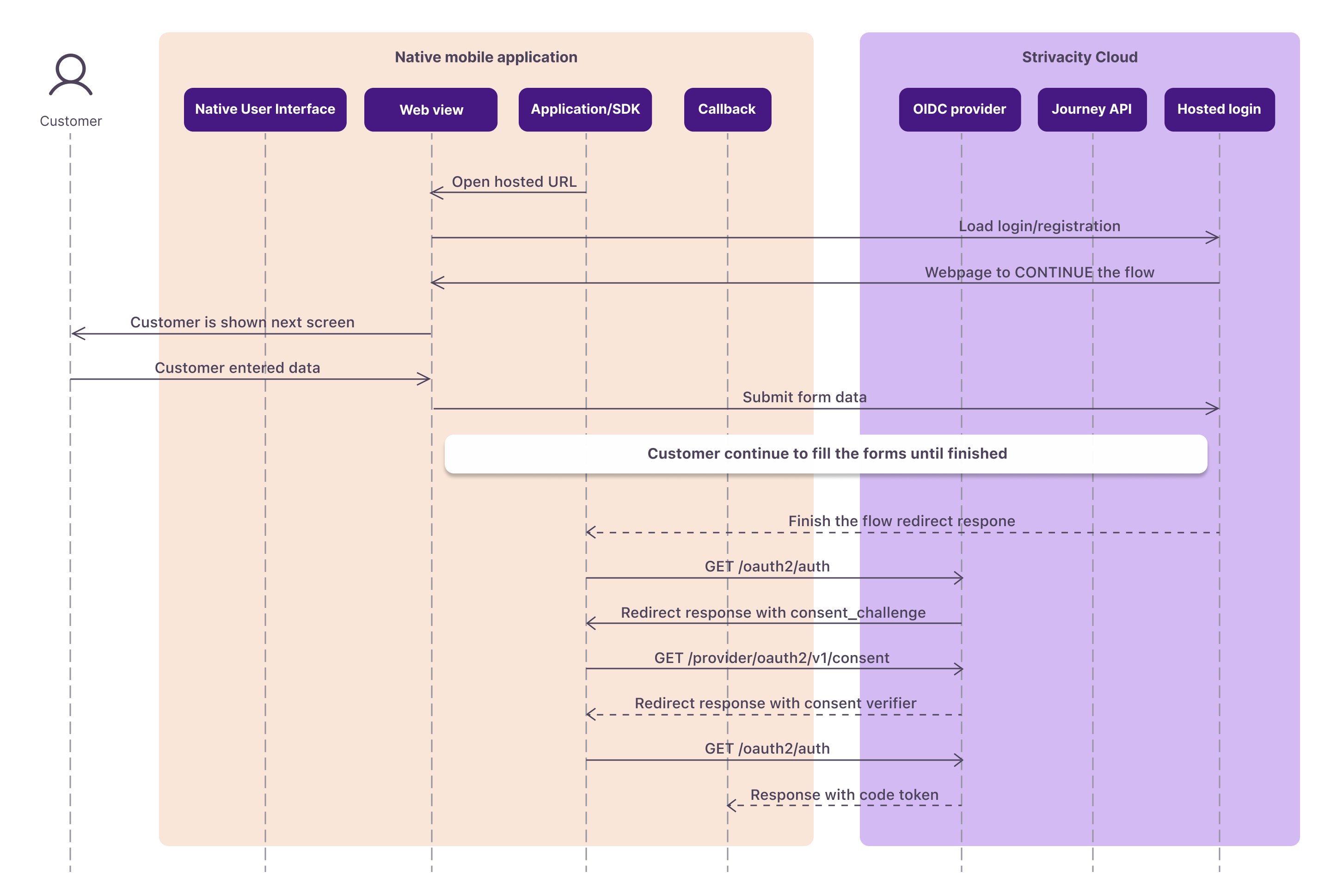 In this flow, the web view in the native application displays no-code components to the customer who interacts with the hosted login until the flow is complete and a code token is returned.